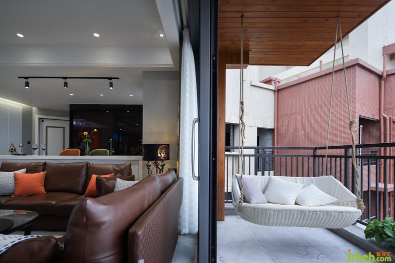 休閑陽臺天花及墻面采用防腐木裝飾,營造優(yōu)美的室內(nèi)花園,搭配雙人搖椅。家,是用來釋放一天的壓力,舒心的地方。