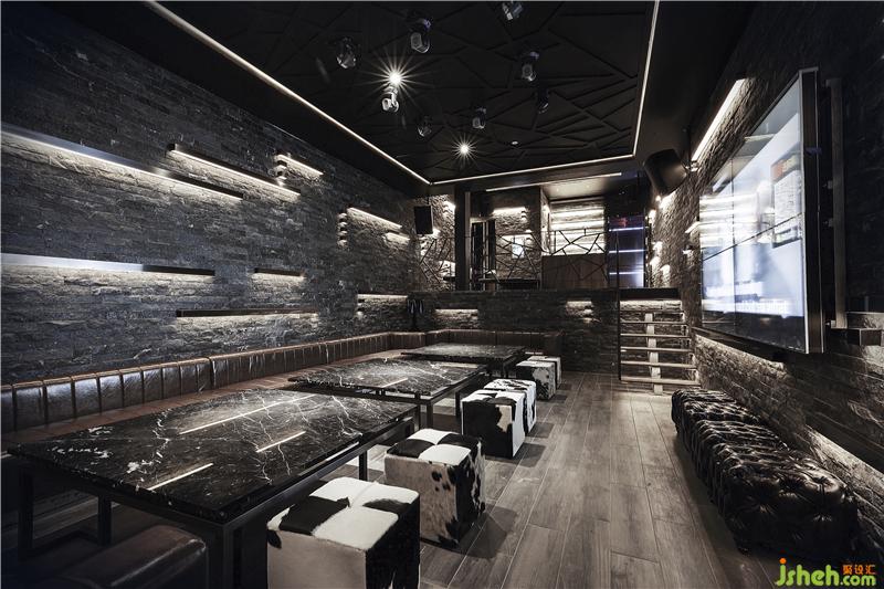 設(shè)計(jì)風(fēng)格的主調(diào)偏夜店風(fēng),設(shè)計(jì)師從“9plus”Logo原型中獲得創(chuàng)意啟發(fā),衍生出墻面、地拼、天花吊頂皆選用折線、硬朗元素。