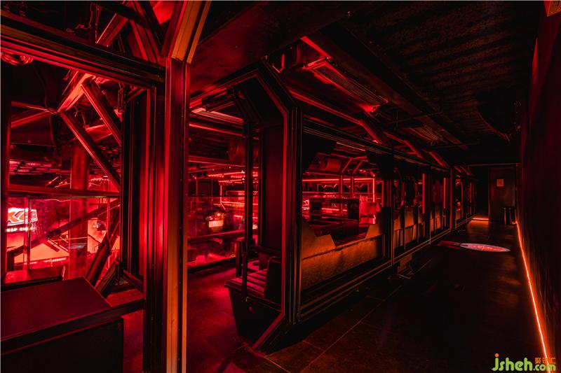 多邊形鋼架形成序列感和強(qiáng)烈的機(jī)械感,引導(dǎo)客人上二層。原有的對(duì)坐卡位全部推翻,改為“中央指揮室“vip包為中心,向四周延續(xù)半圍合式包卡,此布局加強(qiáng)了二層與大廳的互動(dòng),視線一覽無(wú)余,猶如機(jī)艙指揮部,帶來(lái)獨(dú)特視角的尊貴感。
