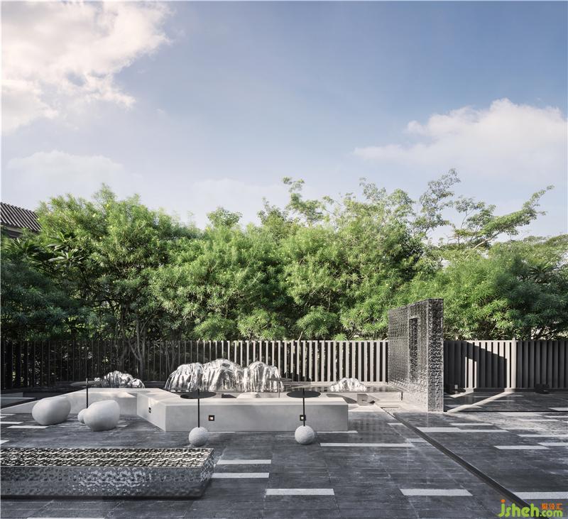With a holistic perspective, the designer creates a courtyard landscape with minimalist skills, creating a clear and open pattern which encourages the interaction between landscape, objects and people. Whether it is a sheet-like grille at a 45-degree angle, or the well-arranged seats in the sunken area, or the pavilion designed with modern skills, or the smooth or rough liner benches, it shows multiple aesthetics and effectively activates the ornamental and practical functions of the courtyard.