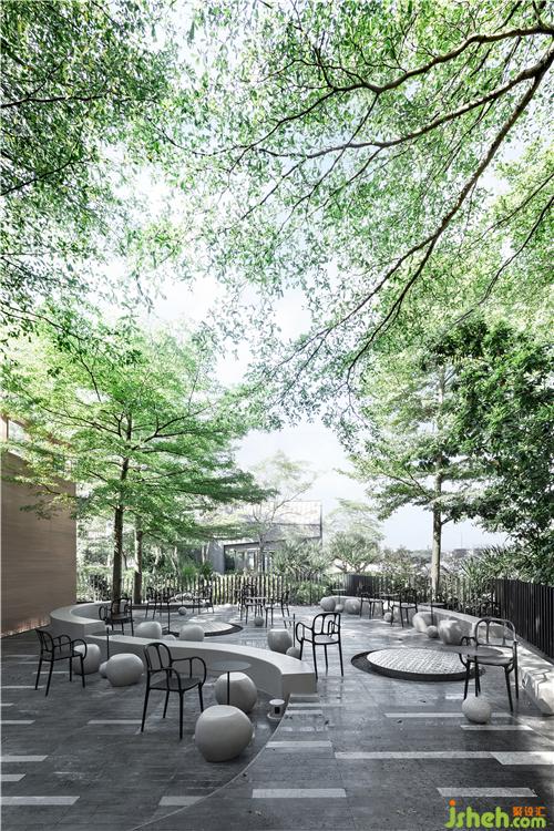 設計師帶著整體性的思維,以極簡的手法營造庭院景觀,造就了明朗和開闊的貫穿格局,讓景與物的契合、人與人的互動流暢而層次豐富。無論是呈45度角轉向序列布置的片狀格柵,下沉地形的座位布局,現(xiàn)代手法變形的筑山亭之景,還是或光滑、或粗糲、或迂形、或直線形的石凳流線,此間多重美學借景自然,寓物以形,有效激活庭院的觀賞美學與實用功能,更大程度上拓寬了社交場域的人流均衡度。