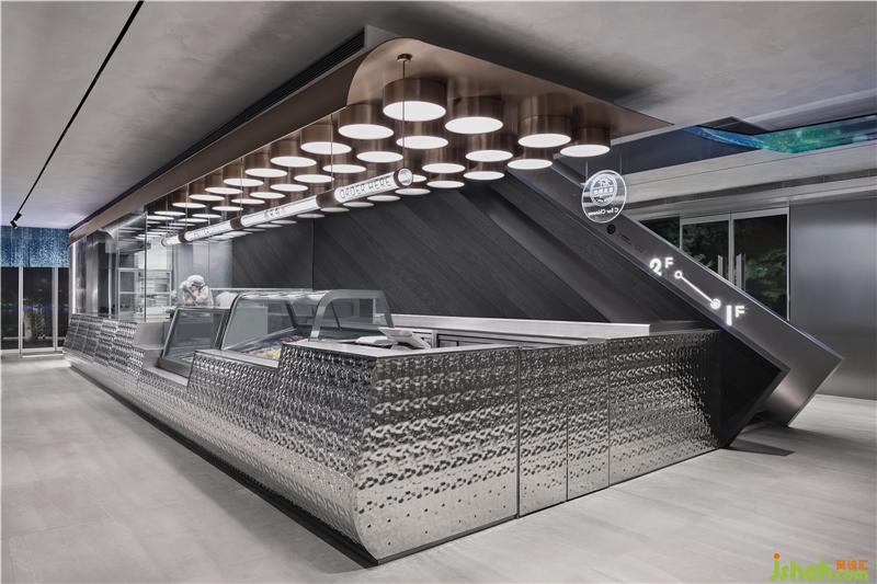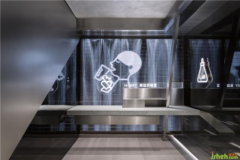周邊實驗室位于入口處,承接著外立面LED電子墻面上的詩意影像動態(tài),結合了金屬格柵的線條美感,與多元周邊產(chǎn)品的陳列關系和融一致。