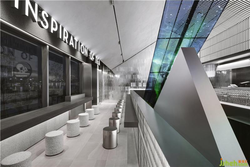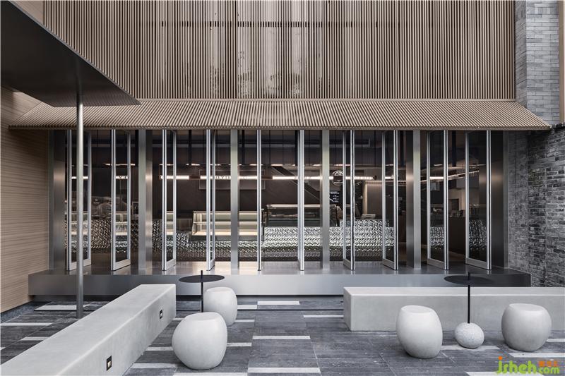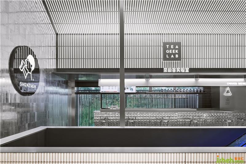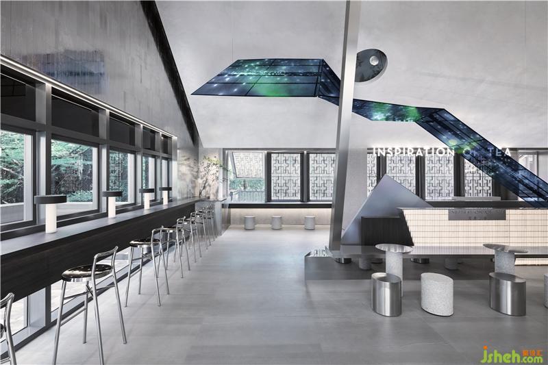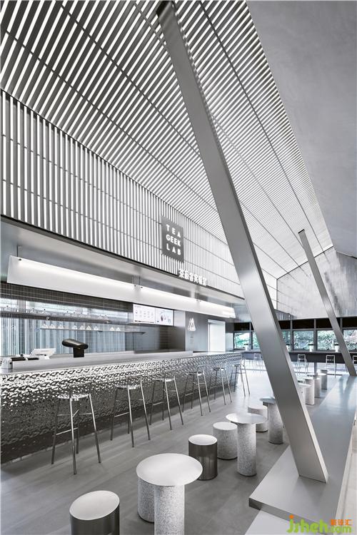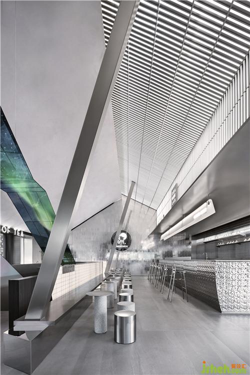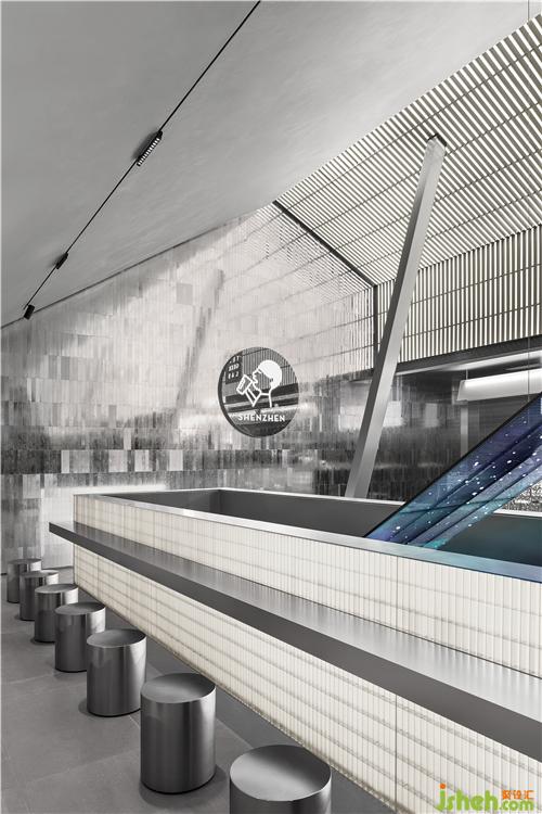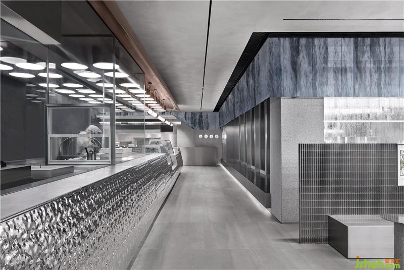 Silver metal bar counter, metal grille details, gray emery floor, and sequential bubble lights as well as the ice-making and dessert displays, connect a series of interesting spaces. At the same time, the floor-to-ceiling glass doors create an interactive visual experience between the interior and the outside landscape.