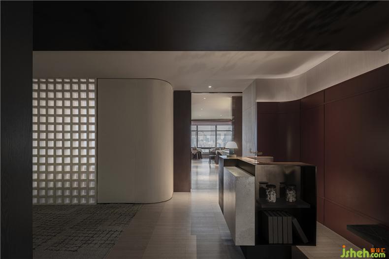 設(shè)計(jì)師將連接貫穿兩側(cè)過廳的廊道,擴(kuò)展為標(biāo)準(zhǔn)公區(qū)的外延,在此開辟出供住戶們品嘗茶點(diǎn)、酒店設(shè)計(jì)閱讀放松之用的餐廳,升級(jí)酒店顧客體驗(yàn)。廊道兩側(cè)入口的玻璃屏風(fēng),增強(qiáng)私密性與儀式感;天花的構(gòu)造運(yùn)用古典建筑手法,以弧度元素與高級(jí)質(zhì)感為整個(gè)空間定下“建筑藝術(shù)”的基調(diào)