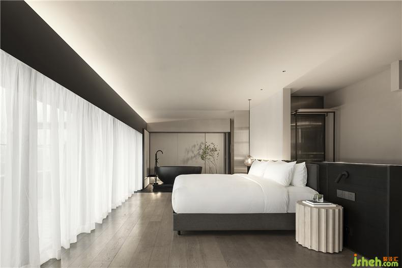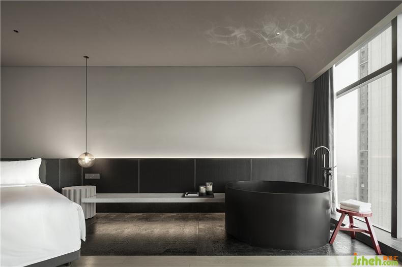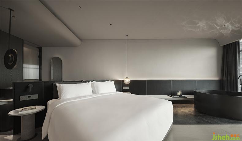 如周作人提及:我們看夕陽(yáng),看秋河,看花,聽雨,聞香,喝不求解渴的酒,吃不求飽的點(diǎn)心,都是生活上必要的 —— 雖然是無(wú)用的裝點(diǎn),而且是愈精煉愈好。何為必要?何為無(wú)用?藝術(shù)就是忙碌生活的“救贖”,酒店設(shè)計(jì)在空間中以藝術(shù)的語(yǔ)言重組。在客房設(shè)計(jì)中,創(chuàng)新布局形式,重組建筑語(yǔ)素,搭配凝練線條、高級(jí)灰色系、靈活材質(zhì),呈現(xiàn)潮人美學(xué)新境界