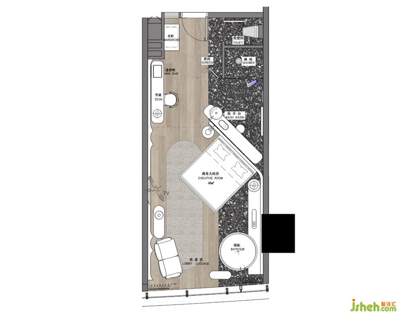突破傳統(tǒng)客房給人的既定場(chǎng)景思維,扭轉(zhuǎn)床背45°,打破常規(guī),重新定義客房秩序。45°斜床位,擁有更直接的視野體驗(yàn),床背拉升出來(lái)的45°背面角所衍生出來(lái)的灰空間,引入盥洗功能,垂直于背后的衛(wèi)浴功能配套,空間從整體秩序煥然一新