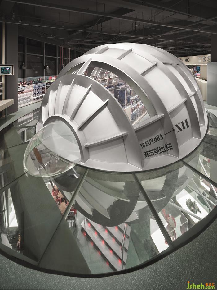 東木巧妙利用了原有空間,打開(kāi)界面,潮玩設(shè)計(jì)將全金屬打造的飛艇與鏈接上下樓層的交通功能相融,置入空間中央。巧妙地營(yíng)造復(fù)古與未來(lái)對(duì)話的科幻場(chǎng)景,同時(shí)提高了空間的利用率。