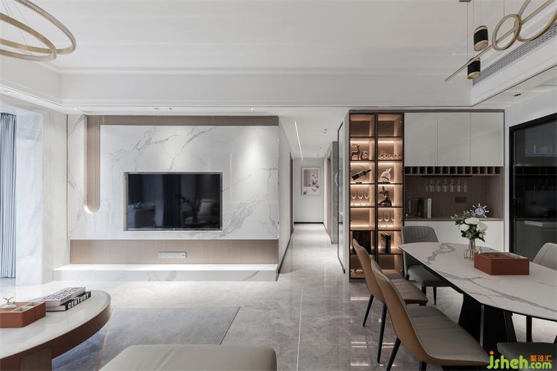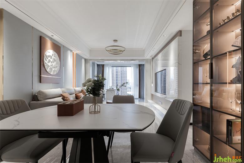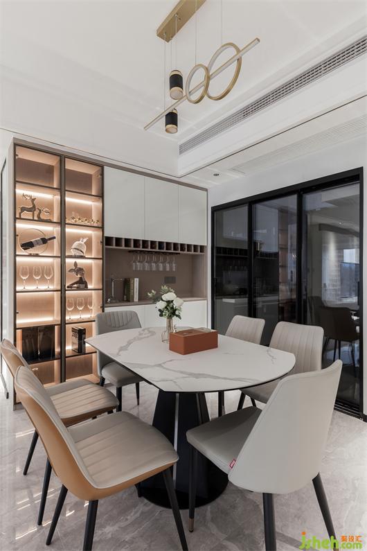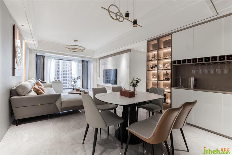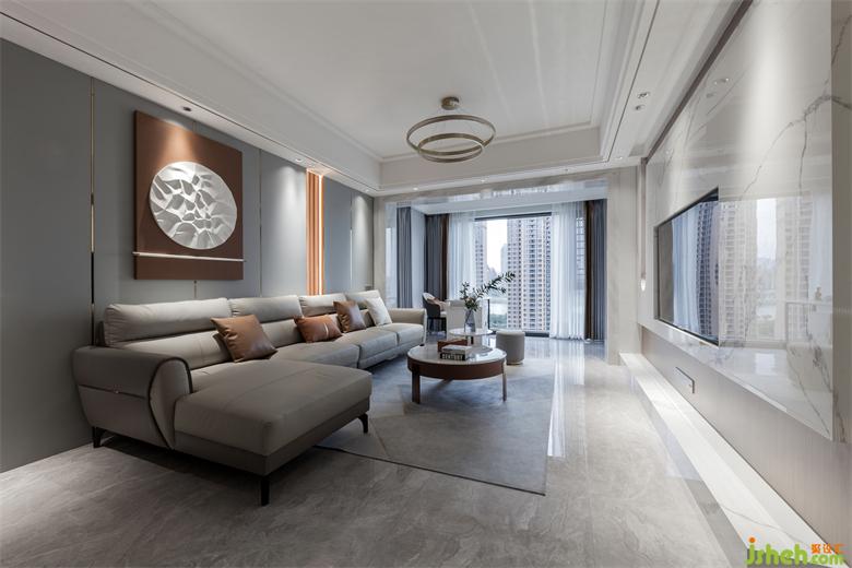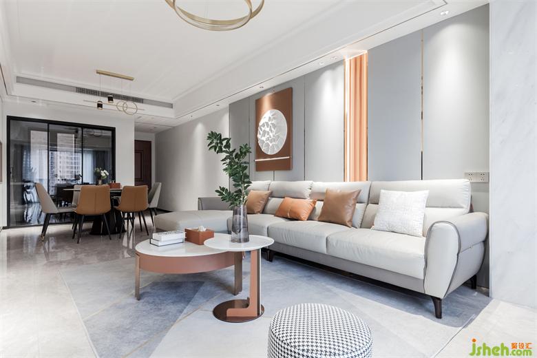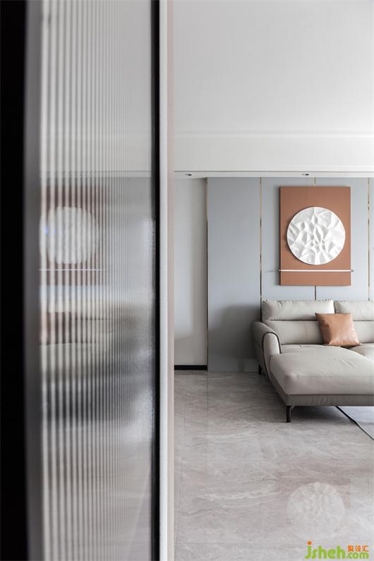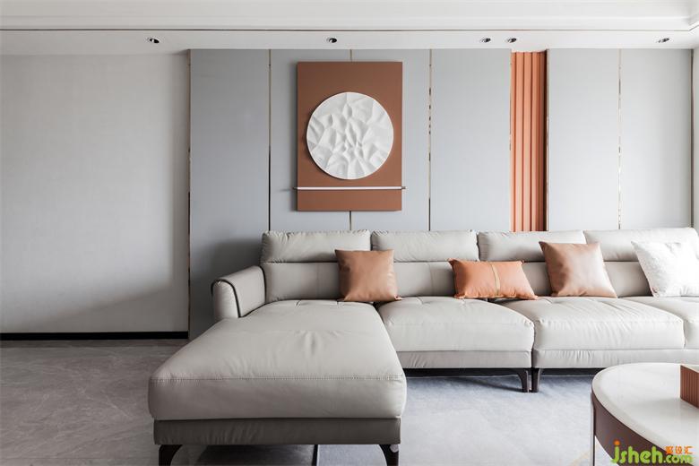 沙發(fā)背景墻采用大片淺灰色皮革硬包設(shè)計(jì),家居裝修搭配以局部愛瑪仕橙的背景和燈光結(jié)合讓空間藝術(shù)感提升,淺咖色的皮面沙發(fā)散發(fā)溫暖靜待入座,整個(gè)空間自然簡單,有趣純粹,線條吊燈恰到好處地點(diǎn)綴其中,細(xì)述了場域的情感交集。