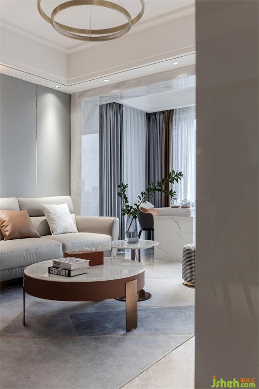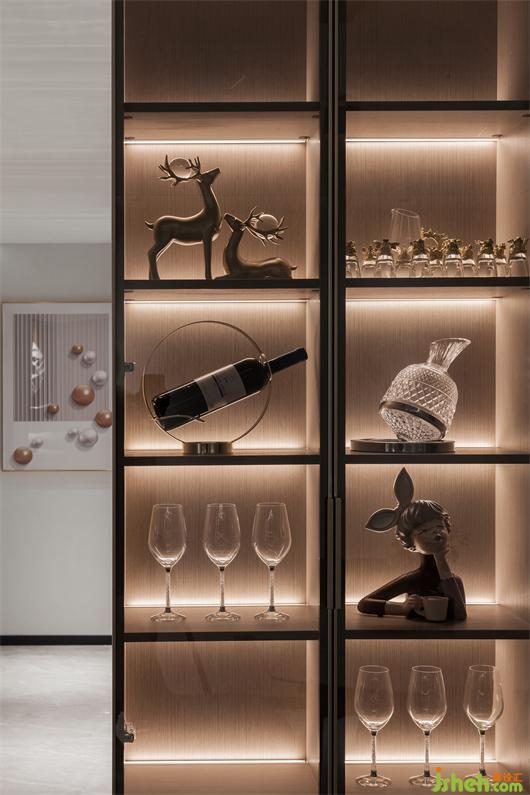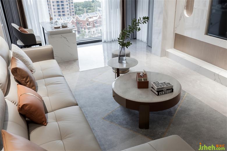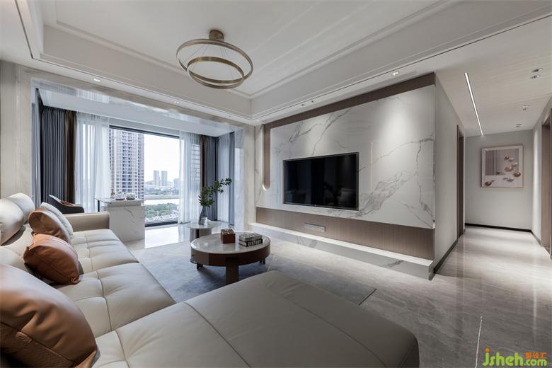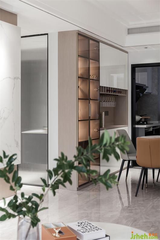 魚肚白巖板電視背景與溫潤柵格木板的有機組合,以材質(zhì)的碰撞出“美”的樣性。