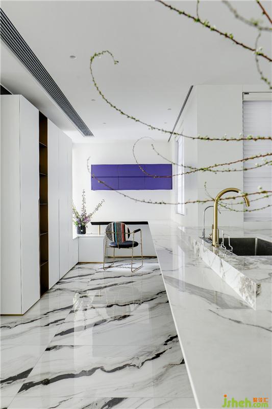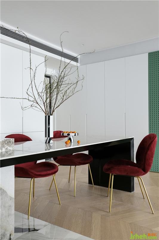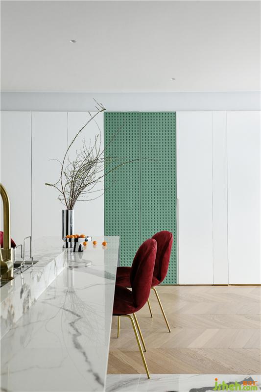 房子的日常是主人生活方式的呈現(xiàn),是一個(gè)家庭生活態(tài)度和審美取向的展示。在餐廳、廚房的設(shè)計(jì)上,我們?nèi)≈匀唬弥匀?,也愛之自然,用綠色點(diǎn)綴空間,加入植物的嵌入,整體空間給予人安寧的體驗(yàn)感,讓居者回到本性中的寧靜清澈。
