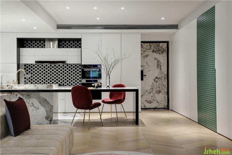 現(xiàn)代主義美學(xué)設(shè)計(jì)為主導(dǎo),溶于輕奢元素,衍生出了格調(diào)高雅、簡約大氣的就餐空間。龍巖裝修設(shè)計(jì)大理石操作臺(tái)、格紋廚房背景墻、長形桌搭配紅色靠椅,設(shè)計(jì)浸潤人心,奏響高雅之曲,演繹奢美的生活格調(diào)。