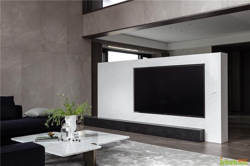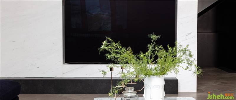 龍巖別墅設(shè)計師采用留白藝術(shù),純白的背景墻搭配純黑的電視屏幕,起到緩沖、協(xié)調(diào)室內(nèi)各要素的作用。沙發(fā)的純黑與大理石細膩的案幾,一黑一白的結(jié)構(gòu),起著支撐整個空間的骨骼作用,使整體觀感一松一弛。