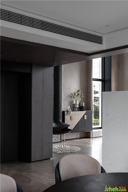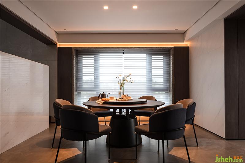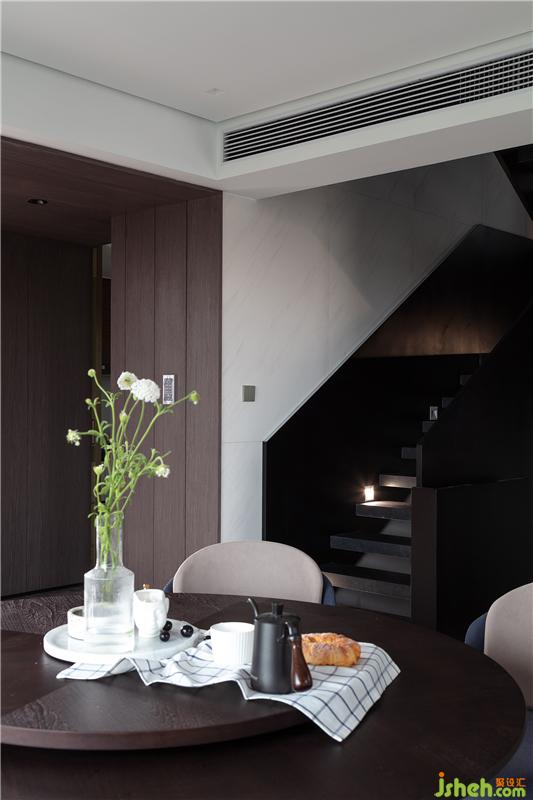 同色系的黑色的桌椅搭配被圓桌圓潤的曲線中和,在保證了降低色彩的純度,豐富色彩層次,給人以安定、平穩(wěn)的感覺的同時,亦增強空間的穩(wěn)定感,營造出樸素、寧靜的室內(nèi)氣氛,更顯親近與溫暖,讓空間變得更具溫情。