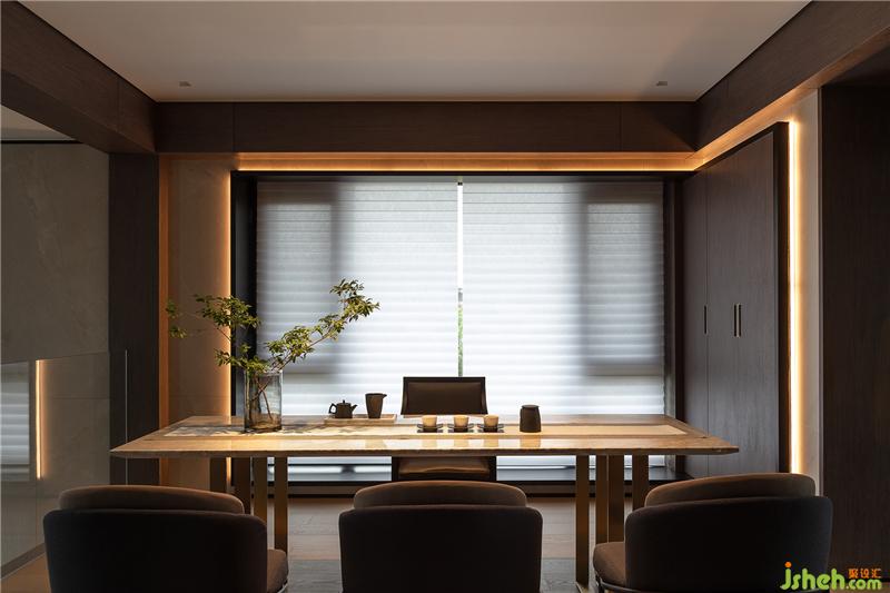 亭亭綠植于前,點綴了整個空間,讓看似簡潔淡雅的基調(diào)實則蘊含了深厚的文化韻味,置身其中回味悠長。枝葉與身后百葉簾的光影相融,三兩筆畫, 勾勒出物體之間的關(guān)系,茶器皆備,三五知己,淺酌慢飲,偷得浮生半日閑。