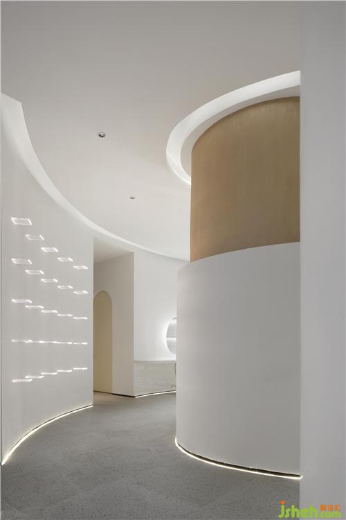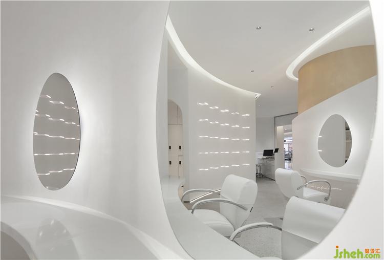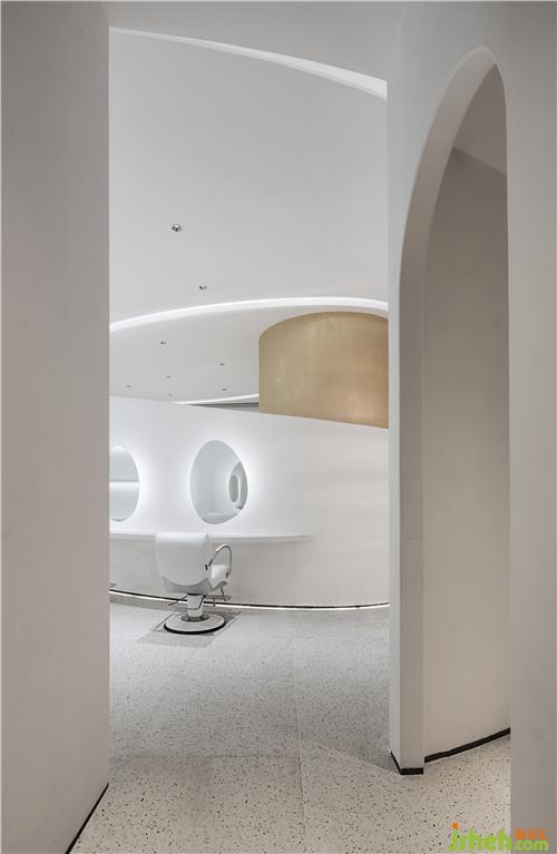 設(shè)計(jì)師在處理中心處的圓柱時(shí),考慮到消費(fèi)者的行走路徑,目標(biāo)是將空間簡化。通過外形近似于拋物線狀的透氣墻面設(shè)計(jì) ,來解放產(chǎn)生障礙的空間并得到空間的連貫性。使理發(fā)區(qū)、接待區(qū)、vip區(qū)得以合理劃分。
