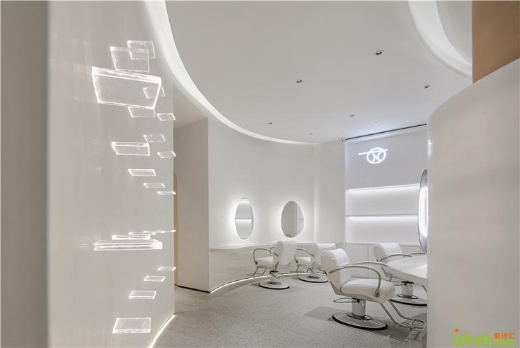 在美發(fā)區(qū)之中,設(shè)有九處理發(fā)臺選用銀色的金屬扶手亦是巧奪天工。裝修公司