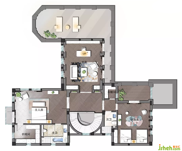 移步到第三層,是第二代、第三代人的居住習(xí)慣,相比于第一代人,對(duì)空間溫度和氣質(zhì)上,他們不適合太華麗的儀式,不適合太過于沉穩(wěn)低調(diào)的色彩。他們?cè)谏钇鹁雍蜁r(shí)間關(guān)系上都會(huì)不一樣。所以我們用柔和淡雅的灰藍(lán)色系去打造一個(gè)年輕人的居住空間,在這個(gè)空間中沒有絲毫壓力。別墅裝飾