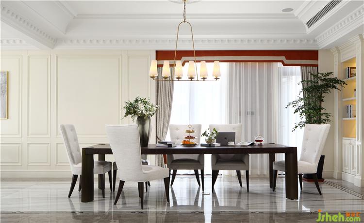 既是餐廳又是工作會(huì)客區(qū)域的設(shè)計(jì)是由兩個(gè)不同形式的空間陳設(shè)方式組成,饒有趣味性的組合。將稍正式的長(zhǎng)桌區(qū)與休閑的圓桌區(qū)餐廳組成兩部分,即舒適自在又有足夠的空間解決家庭會(huì)議。別墅裝飾
