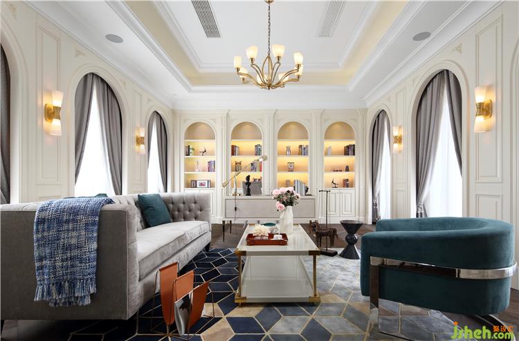為第二代人打造出寬敞的會(huì)客閱讀和睡眠空間,兩面落地的窗戶有一個(gè)很好的視覺通透感,延伸到不同區(qū)域抑或是戶外景觀,在這樣下,陽(yáng)光也忍不住偷偷溜進(jìn)來瞅一眼。兩面分割的圓弧形的窗戶預(yù)留出的窗簾盒子,形成了一處兩面看景呼吸,別致的古典手法打造的景觀分割。這里是關(guān)于藍(lán)色的溫度,漸變的灰藍(lán)色主題地毯是整體空間基調(diào)的延伸,而點(diǎn)綴的藍(lán)色、墨綠的軟裝陳設(shè)則與灰度相當(dāng)?shù)拇竺娣e空間形成強(qiáng)烈對(duì)比。別墅裝飾