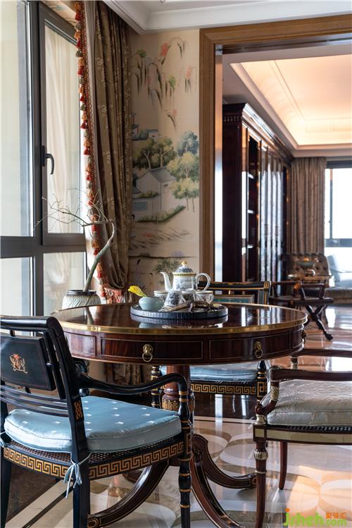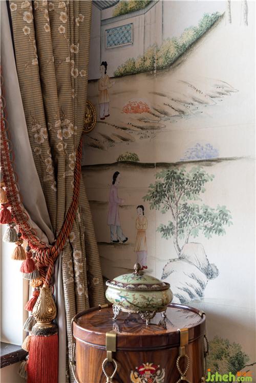 在茶室墻紙的材質(zhì)和表現(xiàn)形式上,沒有選擇常規(guī)的墻紙,客服重重困難力求多元化,材質(zhì)是宣紙,圖案都是純手繪,描述的是清末廣州十三行外銷墻紙上的清末中國人生活圖,呈現(xiàn)出中西文化相互交融的一段歷史氛圍。