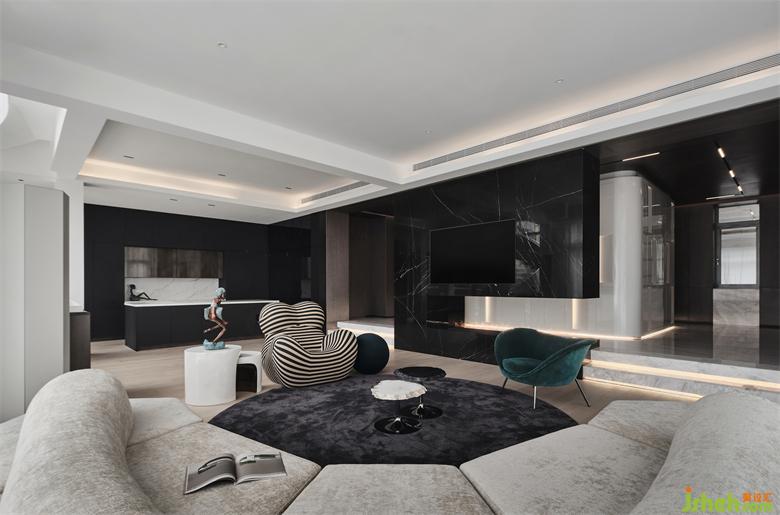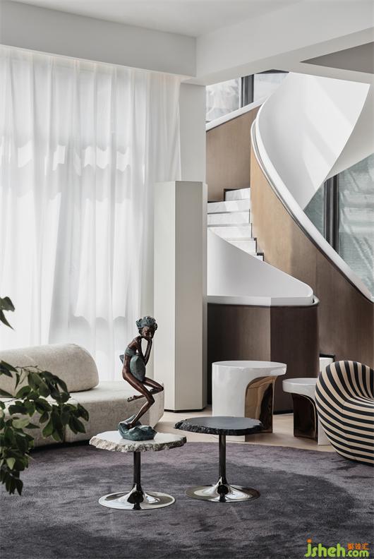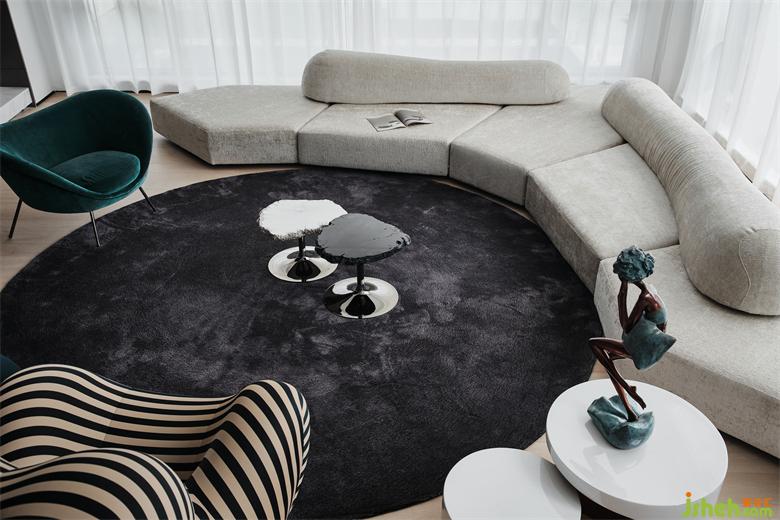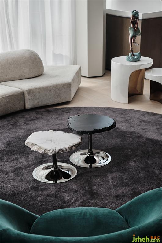 edra環(huán)形沙發(fā)似煙波浩渺的水韻靈動,讓居者卸下疲憊,盡享舒適的居家時光。圓形地毯承載肌理獷達的edra茶幾,讓空間優(yōu)雅之余增添張力,意大利smania桌擺放的古銅飾物,打破客廳常規(guī)之感,于莊重之下透露出克制的張揚。