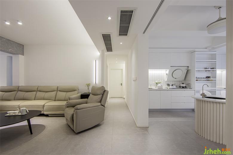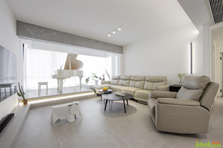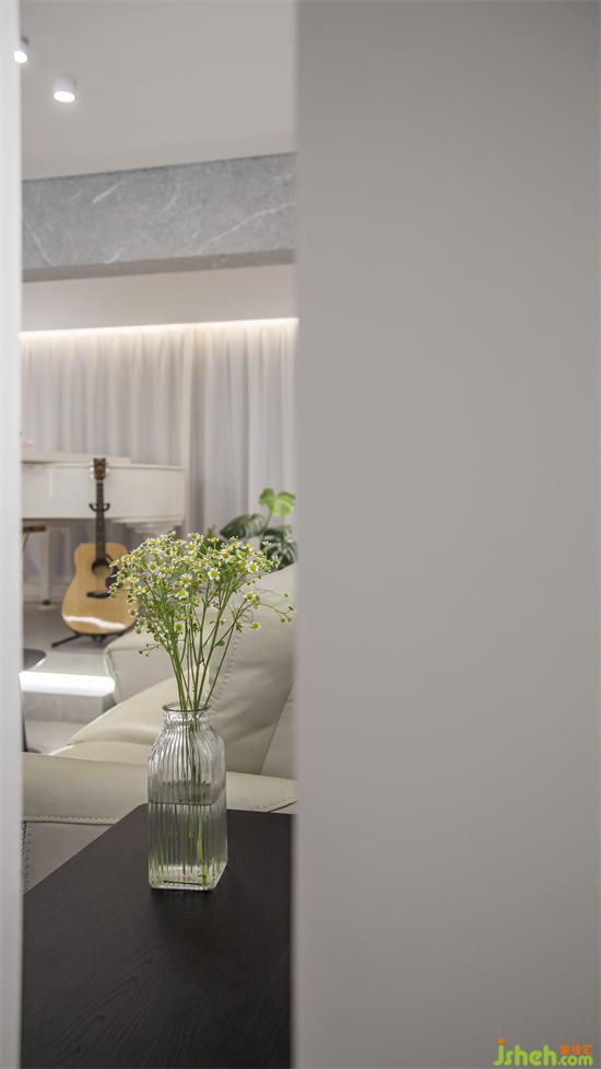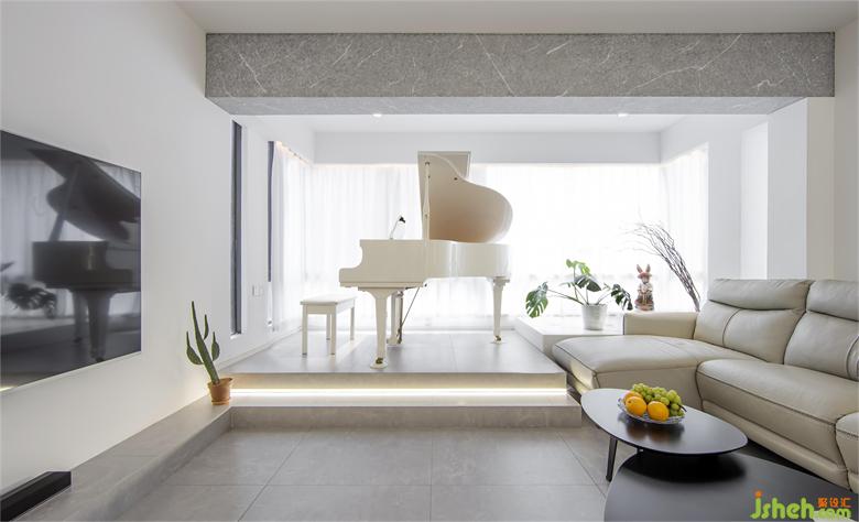 客廳:通過(guò)對(duì)原始對(duì)立墻的刻意外延,加大了客廳的橫向長(zhǎng)度,也支撐起了原始頂梁的視覺力構(gòu)。窗邊“虛化”的演繹臺(tái),詮釋著女主對(duì)鋼琴的特殊情感。水室內(nèi)設(shè)計(jì)泥灰的頂梁是個(gè)性化地存在,切開了舞臺(tái)與觀眾席的區(qū)隔。整個(gè)空間有高有低,有盛開,也有靜默。