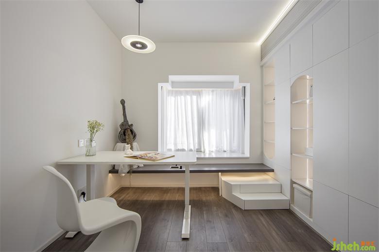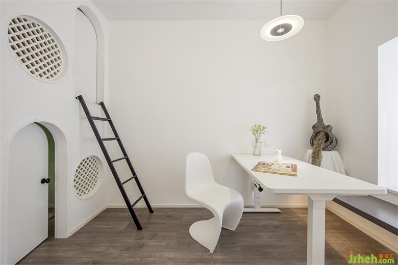 入戶與多功能房:入戶對(duì)立的隱形門和白墻融為一體,將視線引向敞亮的客廳的同時(shí),又對(duì)其門后功能房產(chǎn)生探尋之意,聚集了辦公、閱讀、兒童娛樂的功能間,階梯的建構(gòu)和小閣樓的打造,相映室內(nèi)設(shè)計(jì)成趣。