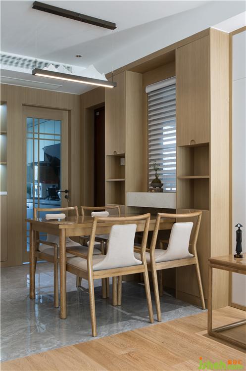 窗戶兩側做成餐邊柜形態(tài),節(jié)省空間,并利用窗戶光線引入用餐區(qū)域。
