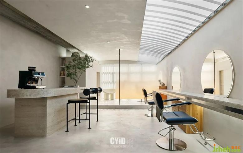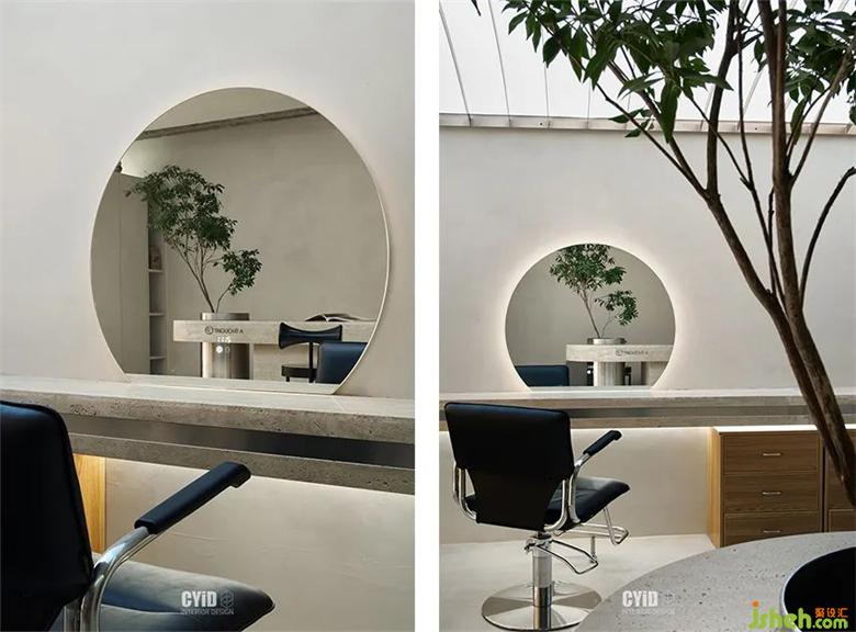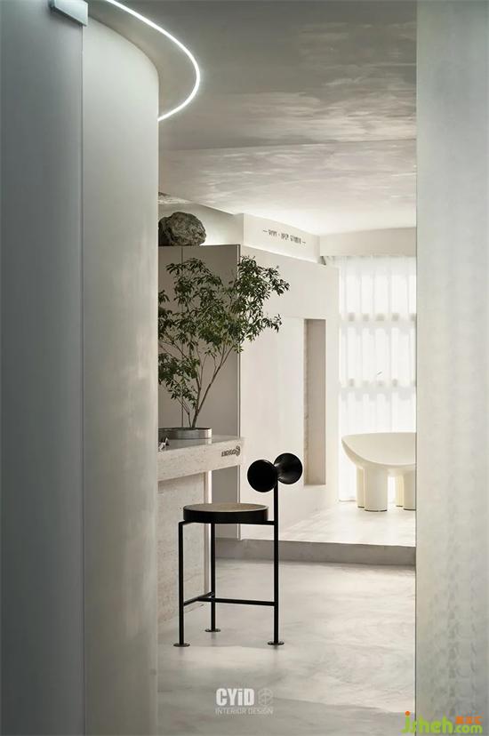 將進門口內(nèi)移,預(yù)留過渡和商業(yè)店鋪設(shè)計緩沖的距離空間,與弧形劃分出的洗護區(qū)域相互配合成整體布局,靈動的弧形與圓潤的曲面元素由外至內(nèi),商業(yè)店鋪設(shè)計營造了一個具有包裹感的進門體驗,流暢的頂面圓弧造型與拱形門洞,激發(fā)了有限空間里的無限韻味,傳達出視覺空間的柔和與純粹,而臨窗的VIP室單獨抬高,賦予其獨立性,半透漸變隔斷增添異彩的同時讓內(nèi)外空間又產(chǎn)生聯(lián)結(jié)。