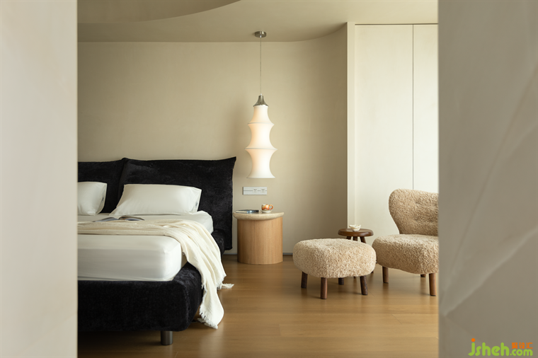 (主臥)將生活方式塑造成獨有的形態(tài),線條和幾何結(jié)構(gòu)簡而清晰,弧線讓氛圍圓融聚合,呈現(xiàn)出舒適的包裹感,婉約自然,不盡回響。而留白的語境里,想象在空間中肆意生長。在日復(fù)一日里,承載著平淡卻綿延的情感。