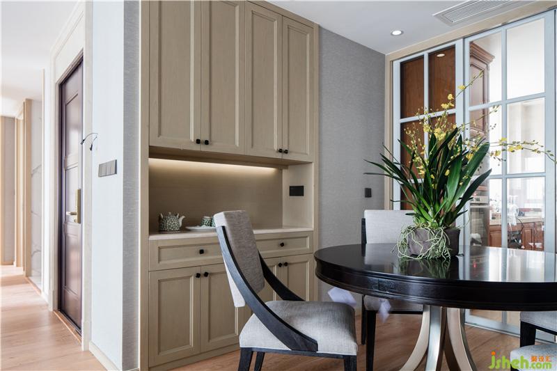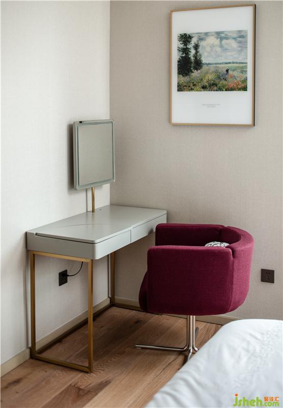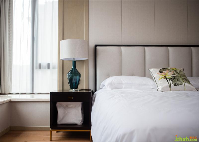 在整個空間中,以溫暖且富有溫度的木材和淺灰色環(huán)保墻紙相結(jié)合作為主色調(diào),局部以人造大理石點綴,通過視覺色調(diào)上達到的平衡,意在烘托出文雅與平靜的氛圍。當暖色的燈光映襯著木質(zhì)的造型,柔柔的蘊色像把一切都覆上了溫暖,讓人充分的放松。