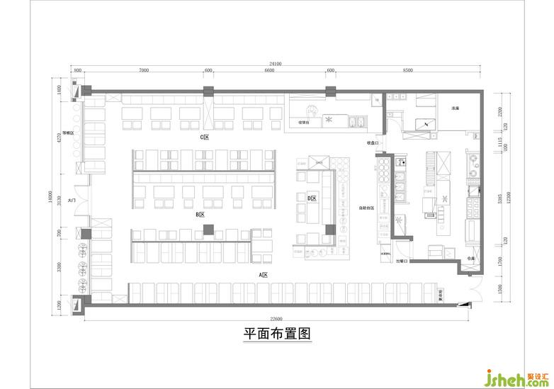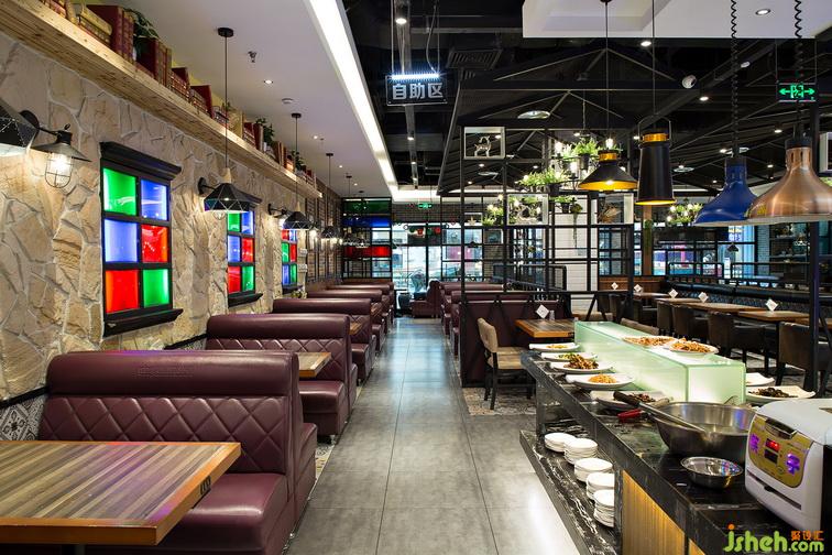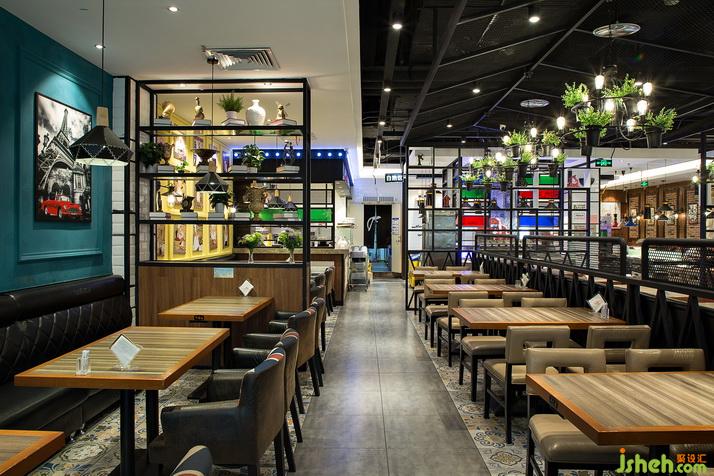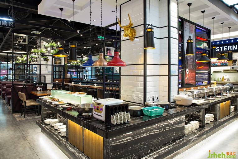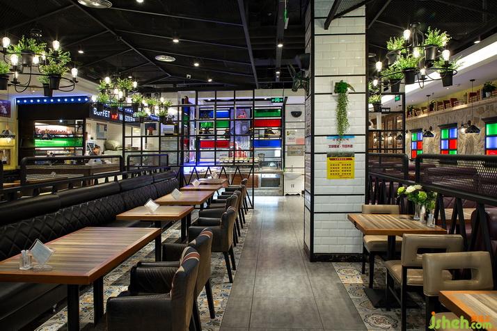 該餐廳的平面布置以自助吧臺為中心將廚房和用餐區(qū)前后分隔開來,這樣可以更好的安排顧客和出餐流導(dǎo)向,同時讓客人更方便的享受沙拉吧臺上的美食,體現(xiàn)新的牛排用餐文化。餐廳設(shè)計