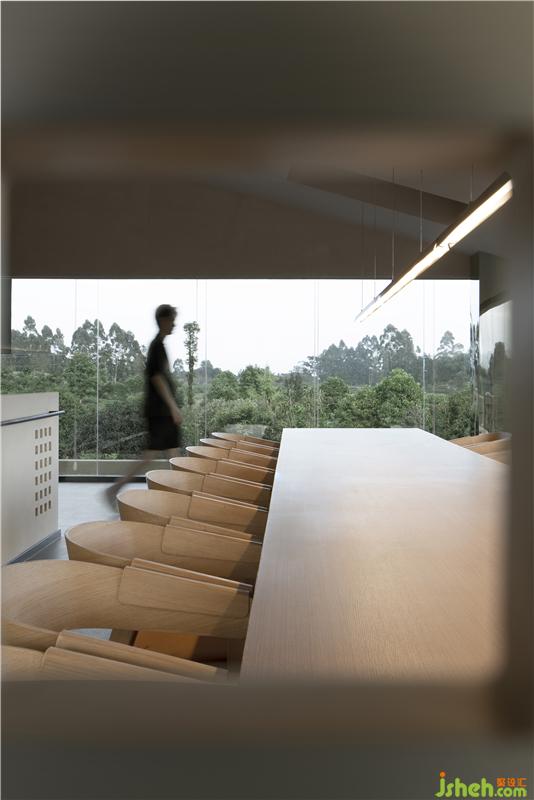 如夢(mèng)似幻,建筑大面積的玻璃幕墻協(xié)同空間內(nèi)外,將“山林、茶園、竹?!钡木爸潞翢o(wú)遮擋地納進(jìn),令建筑視野蔚為壯觀。