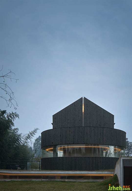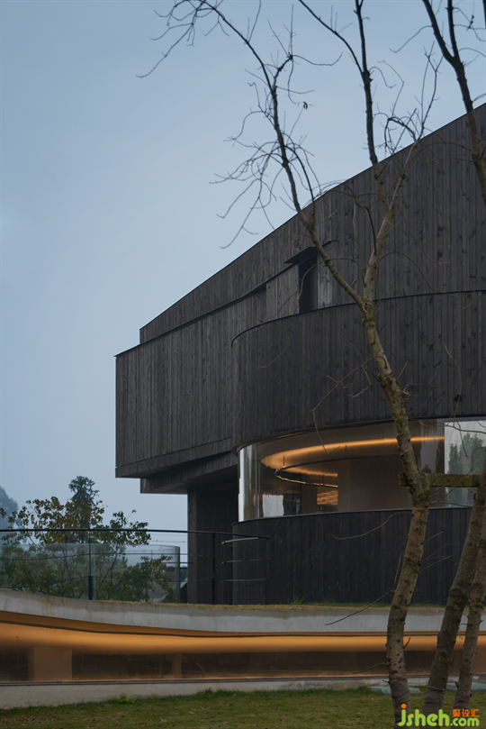 每到夜晚,燈光與夜星輝映,豐富了立面的視覺(jué)效果。立面材質(zhì)采用本地木材廠加工后的杉木板進(jìn)行碳化后安裝。整體黑灰色立面的體感,讓建筑更加低調(diào)內(nèi)斂,同時(shí)也充斥著一絲肅穆的神秘感。