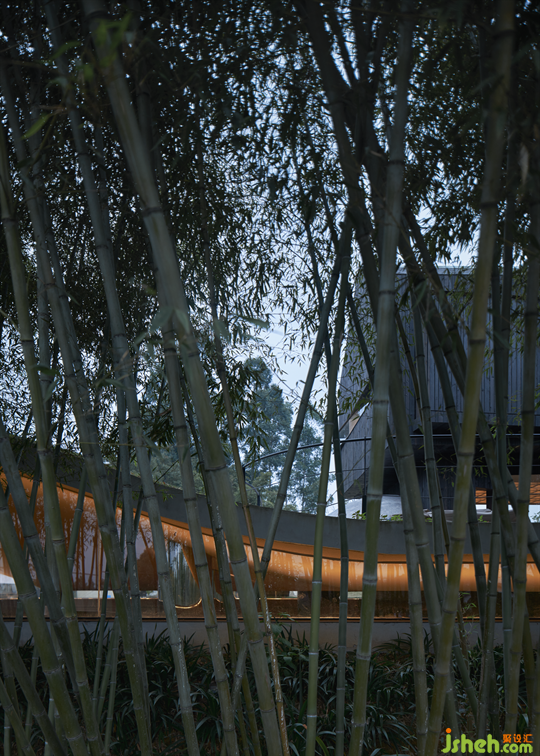 對(duì)自然的致敬鐫刻出一幅在自然中消隱的畫(huà)卷。竹林作為建筑體與綠道的“中間人”,不僅能屏蔽一定程度上綠道通行的噪雜;且竹林本身作為一種自然植物景觀,來(lái)訪者可透過(guò)竹林的縫隙,覓得若隱若現(xiàn)的建筑面貌,既給人以神秘之感,又為建筑帶來(lái)了自然意境上的延伸。