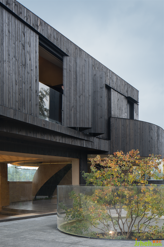踏入場(chǎng)地內(nèi),來(lái)訪者還未感受到建筑內(nèi)部的空間,而是在風(fēng)景與建筑的流線之間游弋。整體體量統(tǒng)一,建筑穩(wěn)重的黑,立于天地,階梯曲徑通幽,細(xì)節(jié)十足。