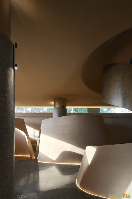 室內(nèi)空間采用雙曲面以及土黃粗砂涂料,由傳統(tǒng)陶土酒壇的形態(tài)與材質(zhì)得來(lái)靈感。用弧線拉開(kāi)格局,用層次劃開(kāi)空間,有動(dòng)也有靜,既優(yōu)雅又靈動(dòng)。低頭品酒,與自己的心靈對(duì)話,無(wú)一不可。