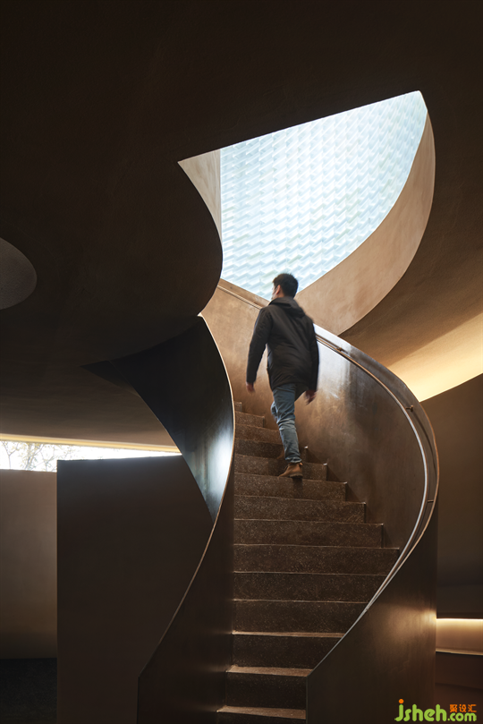 景觀視野被刻意地保持在一定的距離之外,使用者將被自然得逐步引導(dǎo)到內(nèi)部空間中,沿著一條蜿蜒步梯向下走入建筑之中,注意力隨之從室外轉(zhuǎn)換為室內(nèi)。