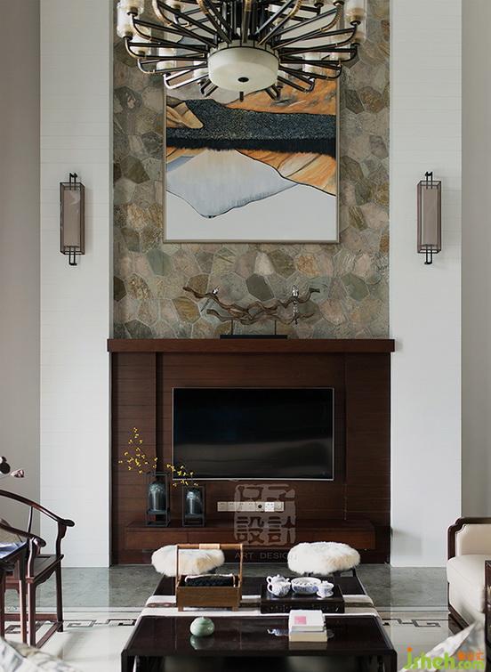 文化石的背景墻上,一副抽象畫仿若不經(jīng)意間堆積的流沙,又如將山河之景攬于家中,大氣之余帶來了現(xiàn)代感。設(shè)計(jì)公司