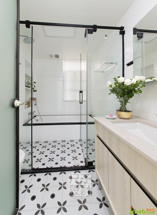 工業(yè)風十足的設(shè)計,利用黑鐵藝框玻璃作為淋浴隔斷,輔以黑白花磚搭配,豐富著干凈明朗的主衛(wèi)空間。
