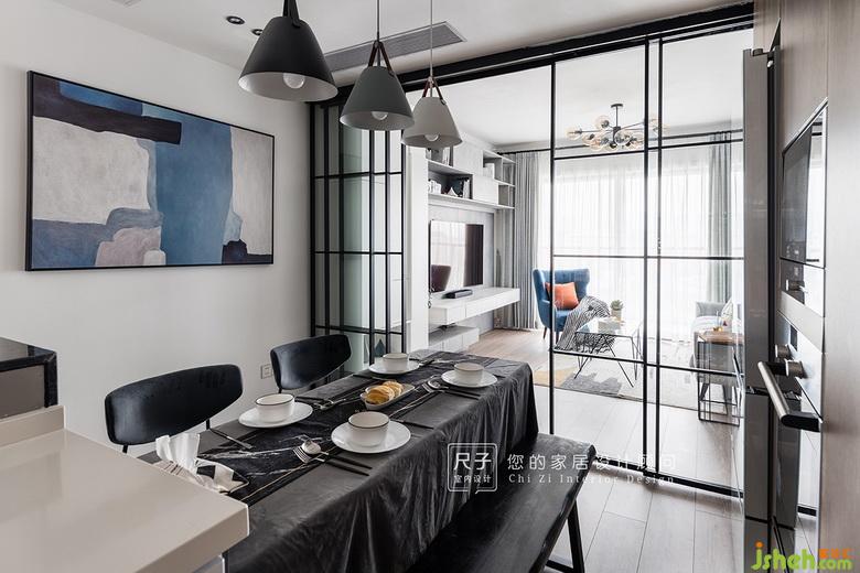 原戶型客餐廚的面積較小,我們將廚房打通,以黑框+玻璃隔斷門替代常規(guī)的封閉門,打造視覺上的開放式客餐廚空間,增加了空間的通透性。深圳室內(nèi)設(shè)計(jì)師
