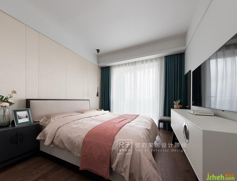 香檳色的硬包床頭與床品搭配實(shí)木地板,舒適溫馨;墨綠的窗簾給臥室?guī)沓领o安穩(wěn)之感。