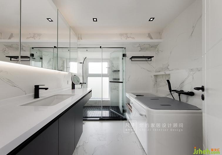 黑色的浴室柜搭配紋理曼妙的大理石紋,打造簡潔實(shí)用的主衛(wèi)空間;我們在活動(dòng)浴缸右上方做了壁龕,方便放置洗浴用品。
