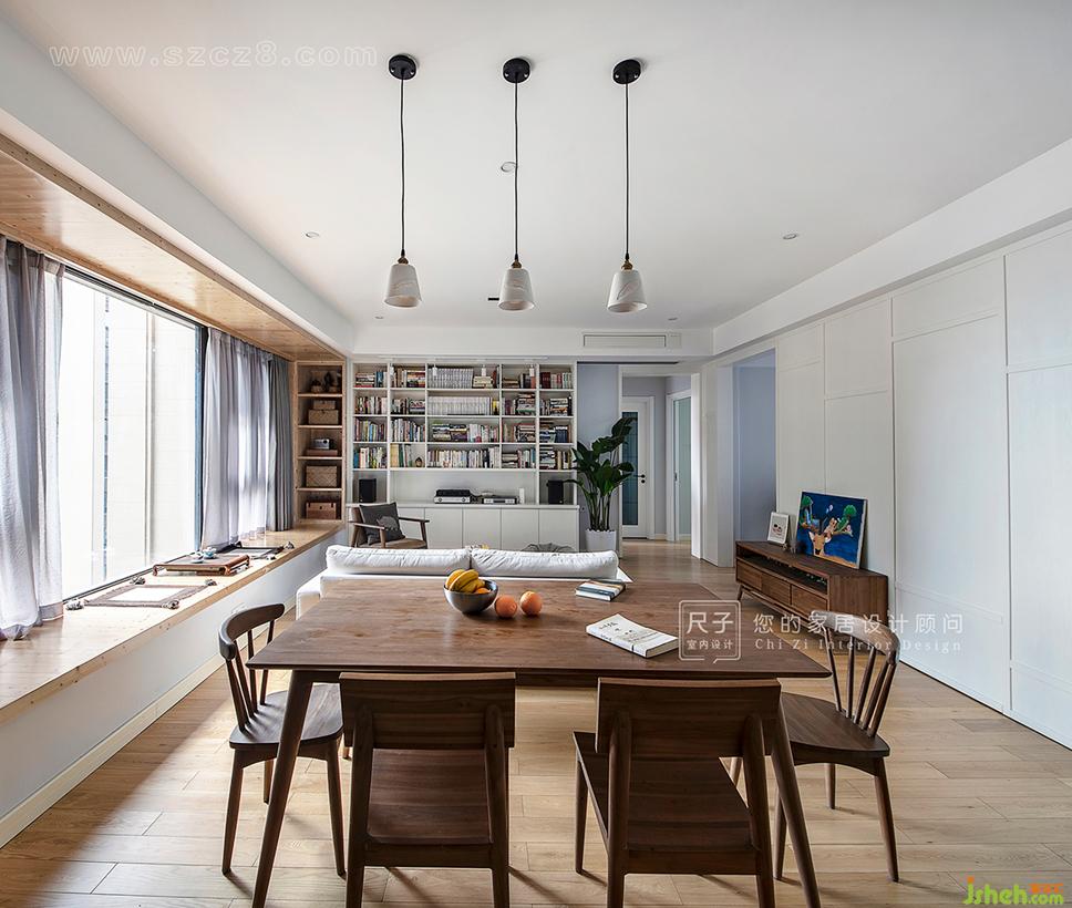 由玄關(guān)步入,客餐空間一覽無余,拋棄了傳統(tǒng)的電視布局;長長的飄窗,占據(jù)著家中最顯眼的位置,與一旁的書架墻構(gòu)成了這個家的核心區(qū)域。設(shè)計公司