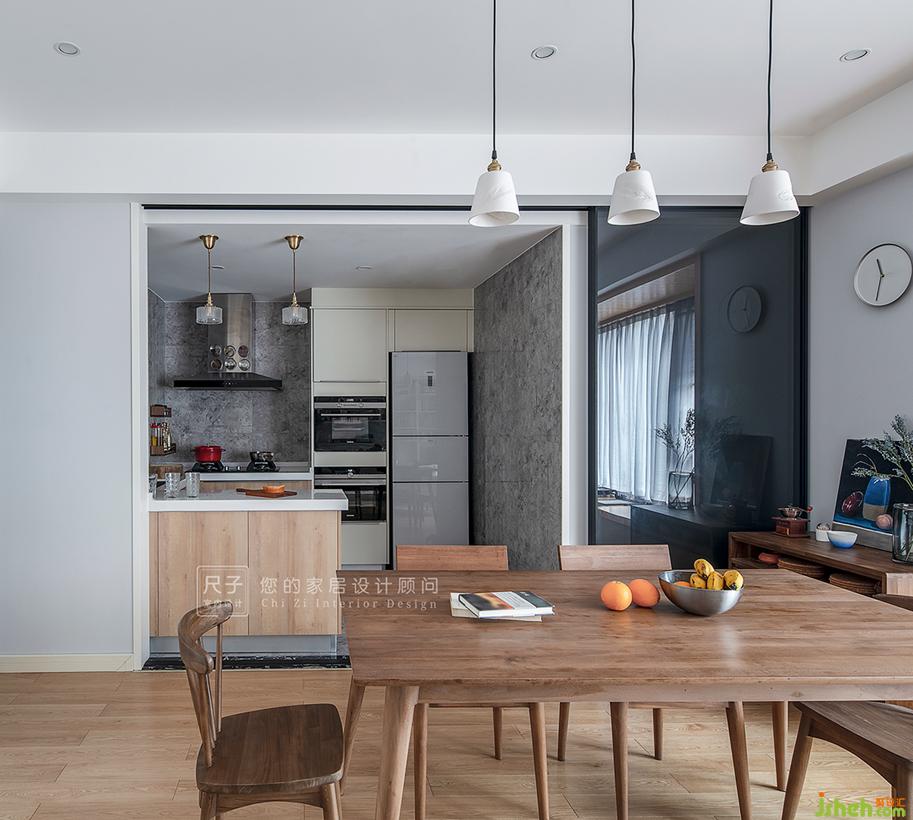 業(yè)主Y先生喜愛下廚,當(dāng)然更喜歡在廚房忙碌之余能看到妻子與小孩玩樂的身影;Y先生烹飪好的美食,便通過U形廚房的吧臺以及玻璃推拉門完成了“交接儀式”。
