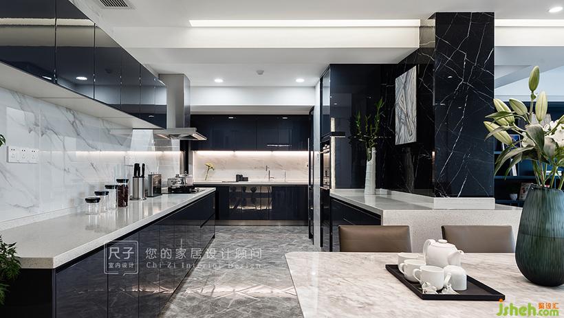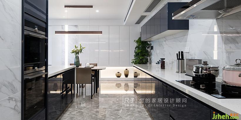 餐廚空間是家庭生活的具象化表現(xiàn),清爽、雅致、潔凈的開放式廚房,完全能滿足業(yè)主為家人做做茶點亦或是偶爾朋友聚會的需求。