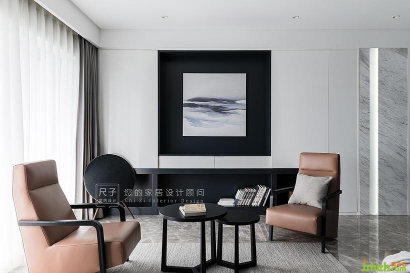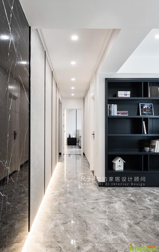 由于過道較長,我們以黑色縱向線條作為裝飾,讓墻面更為挺拔和諧;燈帶的設計凸顯空間層次感。