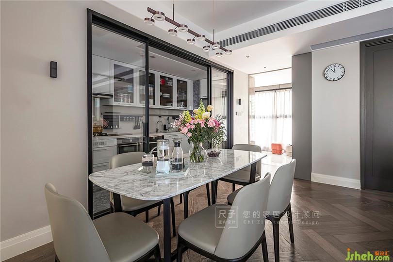 半開放式的設計既實現(xiàn)了餐廚的完美分割,玻璃的材質(zhì)又讓空間整體更為通透。