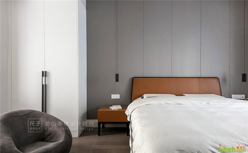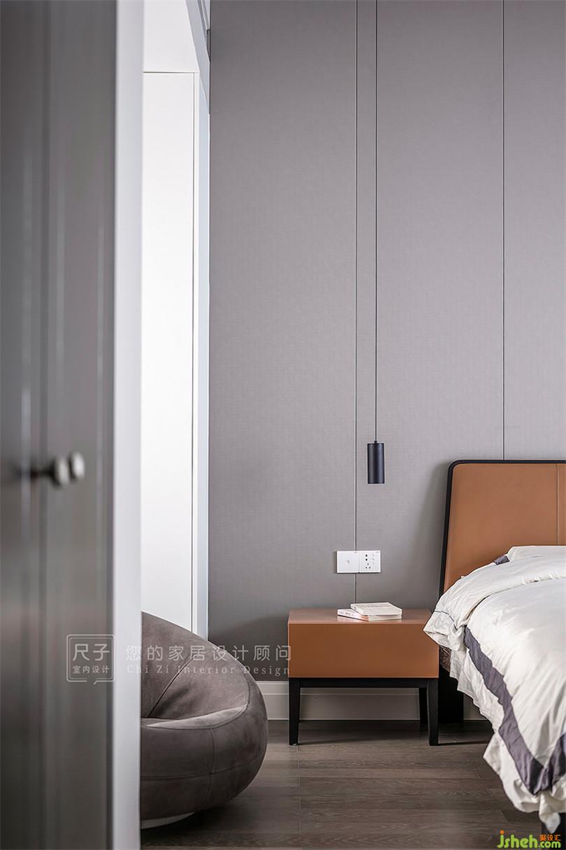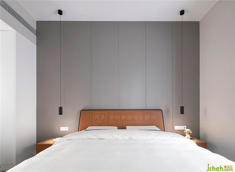 主臥床頭面積較寬,我們以縱向分割的硬包造型來改善視覺表現(xiàn),同時用垂落的兩盞吊燈營造溫暖的氛圍感。