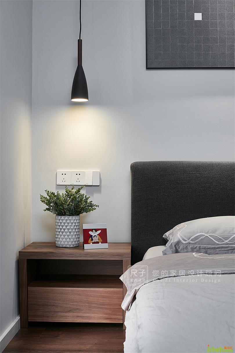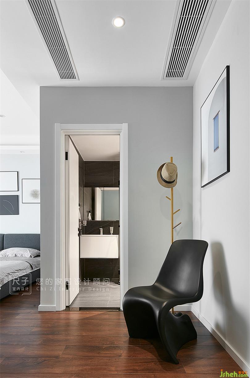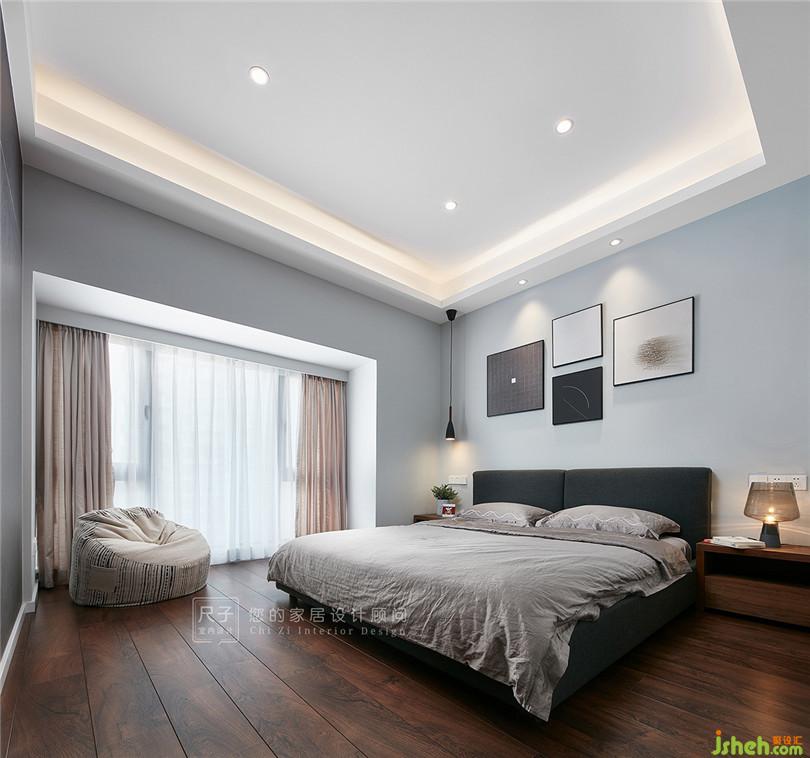 主臥米色、灰色等中性色渲染了寧靜安逸的空間氣氛,落地窗讓室內(nèi)采光極佳,也能眺望城市遠景。